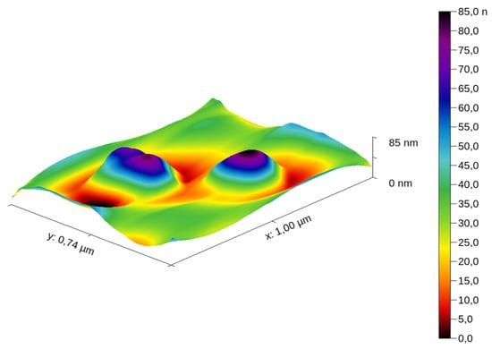 The samples were deposited as described above. Several scans were performed over different regions of the sample prepared, as described in Section 2.3.1, in contact mode and tapping mode. A sample was prepared in the same way but drying was accelerated by placing it on a warm substrate at 50 °C, which resulted in NPs’ agglomeration; therefore, this sample was not used for imaging or extracting profiles. A 3D topography of a scanned region of Ag NPs R2 deposited on the mica substrate is presented in Figure 6.