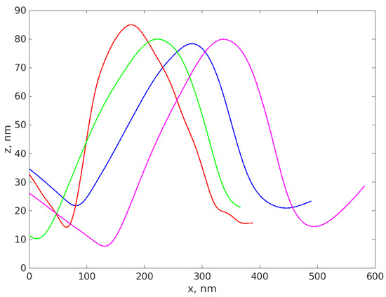 The plot of four profiles extracted over different NPs from the scanned sample, located in different regions of the sample. Z represents the height of the cantilever tip during scanning and x represents the horizontal displacement of the cantilever.
