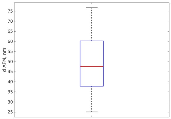 A total number of 29 profiles was carefully extracted from the sample and the height of each profile was assessed as described in Section 2.3.1. The average height (and hence the average AFM diameter) was 49 nm and the standard deviation was 14 nm; therefore, we can conclude that the AFM diameter dAFM = 49 +/− 14 nm for AgNP-R2 sample. A boxplot of the diameter values is presented in Figure 8 and illustrates the distribution of the AFM diameter values. The same procedure was used for AgNP-R1 and for Ag-77.