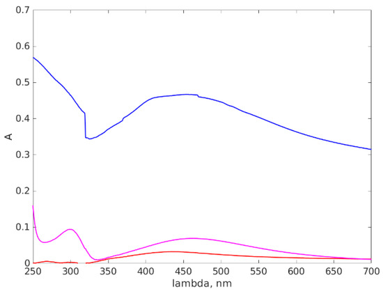 The absorption spectra of the Ag NP aqueous suspensions. The vertical axis represents the absorbance of the suspension and the horizontal axis represents the wavelength. The red line stands for the AgNP-R1 absorption spectrum, the purple line for AgNP-R2 and the blue line for the Ag-77.