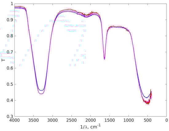 The Fourier Transform Infrared spectrophotometer is used in Ag NPs’ structural characterization to determine the functional groups found in the suspension, starting from the reducing agent that was used, and to provide information about the chemical environment of Ag NPs. An ALPHA spectrophotometer from Bruker with an ATR crystal attached was used in this study within a range of 400–4000 cm−1 wavelengths at 24 scan times at a resolution of 4 cm−1 for both Ag NPs suspensions in transmittance mode. The vibrations of the molecules produced by the infrared irradiation are detected at different wavelengths and shown in the spectra [90]. The spectrum reveals interactions obtained during the synthesis process and shows the adsorption of functional groups on the Ag NPs’ surface. The implementation of FT-IR as characterization procedure for Ag NPs suspensions is reported in other research studies, such as [91,92].