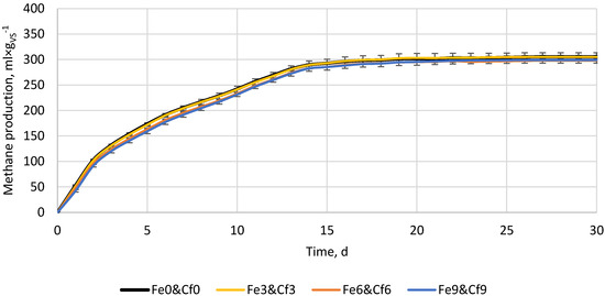 | Brewer’s spent grain | 11.7 | 3.0 | 2.88 | Agriculture biogas plant digestate | 150 | 7.95 | 4.71 | Iron powder | 0, 0.2, 0.6, 0.95, 1.34, 1.70, 2.30 | Batch | Yes | 400 | 153 | 37 | 30 | 0.38 | 0.61 | × Fe supplementation increased methane yield in each experiment; the highest increase of 9.8% was obtained at doses of 0.6 0.6 g × L−1 | This study |