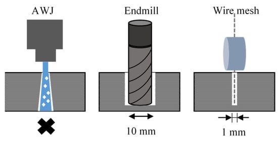 - Suzuki, K.; Koyasu, R.; Takeda, Y.; Sasahara, H. Application of a novel woven metal wire tool with electrodeposited diamond grains for carbon fiber reinforced plastics core drilling. Precis. Eng. 2019, 56, 386–394. [Google Scholar] [CrossRef]