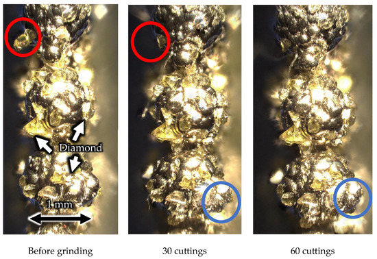 - The wire mesh grinding wheel showed almost no wear after 6000 mm of machining. It has a low modulus of elasticity, so it deforms moderately even when an impact processing force is applied. This avoids impact input to the diamond abrasive grains and is assumed to avoid grain crushing.