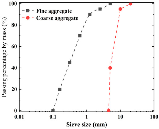 The original concrete was prepared by using PC.42.5R composite Portland cement with a dry density of 3.1 × 103 kg/m3, natural coarse aggregate with a nominal particle size of 5~20 mm (apparent density of 2715 kg/m3), natural river sand with a fineness modulus of 2.58, and tap water as raw materials. The particle size distribution of fine and coarse aggregate is shown in Figure 1. The mix proportions of concrete were determined according to Chinese standard JGJ55-2011 [41], as shown in Table 1. The concrete cube specimens (100 × 100 × 100 mm3) were placed in a standard curing box at a temperature of 20 ± 5 °C and a relative humidity of 90% for 1 day during the curing process. After the initial curing stage, the specimens were soaked in saturated Ca(OH)2 solution for 28 days, and the compressive strength of the concrete specimens was measured (as shown in Table 1). The original RCA samples were prepared by crushing and screening the concrete specimens using an E-type gravel crusher and a shock-type standard vibrating screen. RCA samples with their nominal particle size ranges of 10–20 mm were selected for this experiment. According to the method specified in Chinese standard GB/T14685-2022 [42], the initial apparent density of an RCA sample was measured to be 2479 kg/m3, and the initial water absorption was 5.34%.