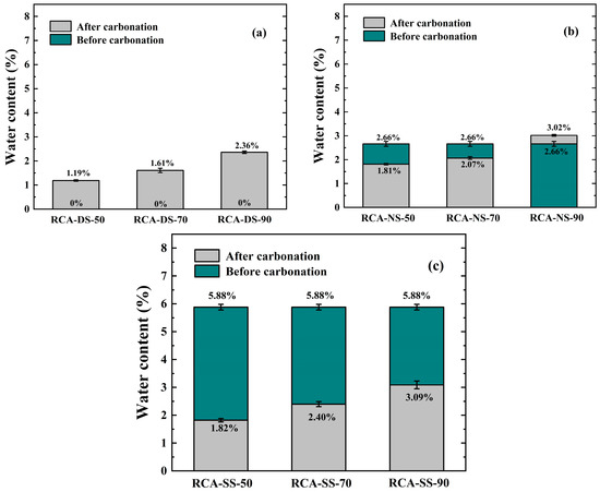 Figure 3 shows the measured results of the water content of the RCA samples before and after carbonation under different moisture conditions.
