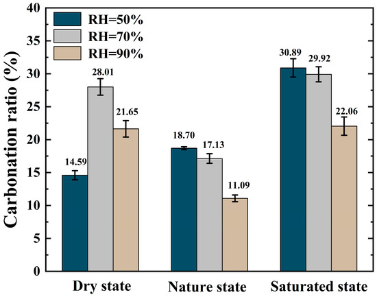 In the carbonation environment with RH = 50%, the carbonation ratio of the RCA sample increased with increasing IWC and reached 30.89% when the RCA sample was saturated; this was the largest carbonation ratio group in this experiment. In the carbonation environments with RH = 70% and 90%, the carbonation ratios of the dry and saturated RCA samples were higher than those of the natural RCA samples.