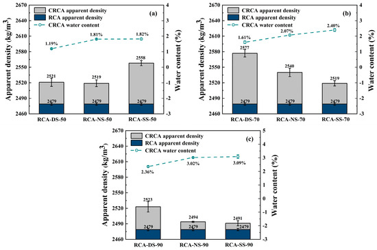 Figure 6 shows the measured apparent density for the CRCA samples under different moisture conditions as calculated by Equation (2):