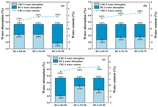 Figure 7 shows the measured results of the water absorption of the RCA samples after carbonation under different moisture conditions, as calculated using Equation (3).
