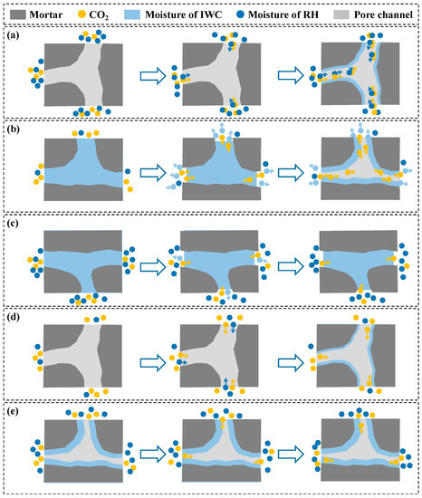 Different moisture conditions in carbonation process of RCA: (a) high RH with low IWC; (b) low RH with high IWC; (c) high RH with high IWC; (d) low RH with low IWC; (e) RH and IWC in relative equilibrium.