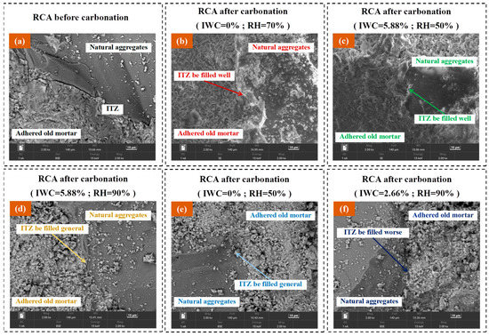 When the RCA sample was under the condition of low RH with low IWC (as shown in Figure 8d), due to the low initial water content of the RCA sample, the ability of CO2 to permeate RCA was poor. Additionally, due to the low RH of the carbonation environment, the infiltration of the RCA sample by moisture from the environment was limited, which resulted in the insufficient ability of CO2 to diffuse in the internal pores of the RCA sample. The abilities of CO2 gas to permeate RCA and diffuse were poor when the RCA sample was carbonized under such moisture conditions. For example, in this experiment, the water content of the RCA-DS-50 sample after carbonation increased to only 1.19%, and less moisture from the environment infiltrated the sample, which inhibited the penetration and diffusion of CO2 and resulted in a little improvement in the properties of the sample. Figure 9a,e show the microstructure of the original RCA sample before carbonation and the RCA-DS-50 sample after carbonation; the ITZ was generally filled with carbonation products after carbonation.