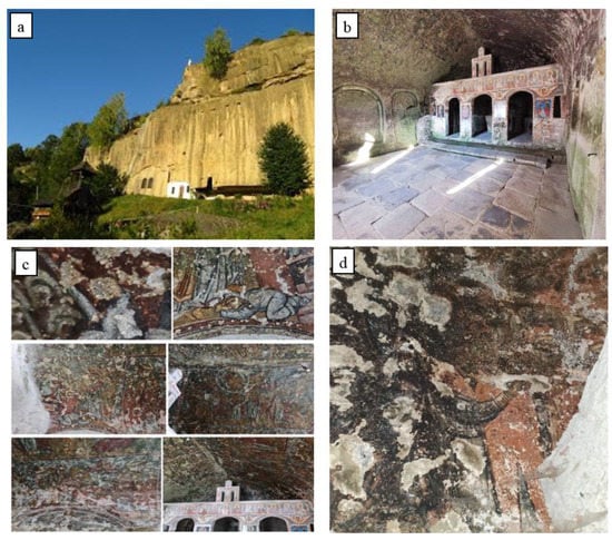 The al fresco painting was made at the beginning of the 14th century. Since the enclosure was excavated in the sandstone wall (Figure 1), the support on which the painting is applied has a relatively a uniform appearance, the roughness required for the application of the mortar layers for the fresco being provided by carving the sandstone. The support layers of the fresco are made on a lime base with straw inserts. Water infiltrations through the sandstone wall, temperature variations and biodegradation processes determined the advanced deterioration of the frescoes (Figure 1b–d).