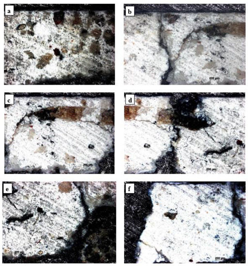 Mortar microstructure by microscopy in polarized light (OMPL): (a) hard inclusions in the mortar; (b) propagation of the crack from the top of the row and of the contraction crack in the vertical plane; (c,d) degradation by cracking; (e,f) inclusions, compactness defects.