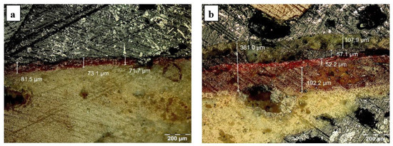 The optical microscopic analysis of the painting layer revealed two situations: an area with a relatively clean outer layer, red in color, with a thickness of approximately 50 µm (Figure 3a), and an area with a thick layer, consisting of deposits, with a thickness greater than 100 µm, under which there is a layer of red pigment with a thickness of approximately 50 µm. Under the pigment layer there is a light red area, with a thickness greater than 150 µm, the intensity of the color decreases from the pigment layer towards the interior of the mortar, which shows that the pigment has diffused into the mortar (Figure 3b). The phenomenon is typical for a fresco painting on a wet support.