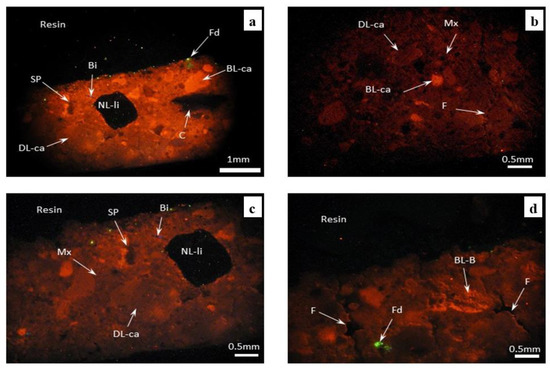 (a–d) Fragment of fresco under cathodoluminescence microscopy. BL-ca—carbonate lithoclast with bright orange luminescence; DL-ca—carbonate lithoclast with dull luminescence; NL-li—non luminescent uncertain lithoclasts; Fd—feldspar grain with green bright luminescence; Bi—biotite with dull blue luminescence; BL-B—bioclasts wih bright orange luminescence; C—carbonized plant fragments; Mx—dull luminescent matrix; SP—secondary porosity resulting from selective dissolution; F—irregular fissures.