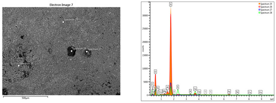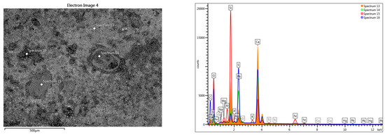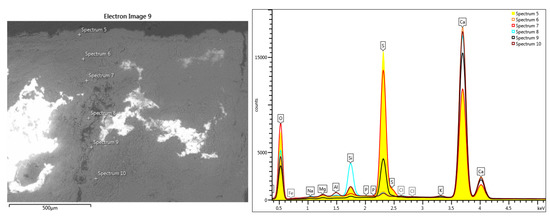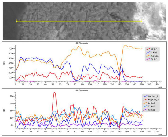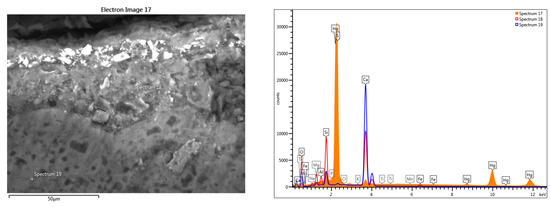 The line-scan analysis, on the thickness of the mortar layer, is presented in Figure 8. From the point of view of the composition, the presence of magnesium and calcium is noted throughout the thickness of the mortar. The superimposed spectra of the composition determined at different points located from the surface to the interior, in an area without pronounced degradation of the mortar layer (Figure 9), show high concentrations of sulfur near the surface (spectra 5,6), and a decrease of sulfur concentration at the surface of the layer towards its interior (spectra 9,10).