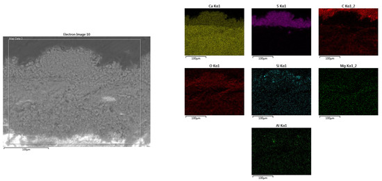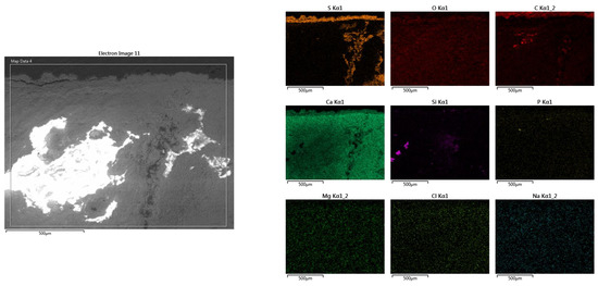For the area of the mortar layer showing advanced internal degradation (Figure 7b), the elementary SEM-EDS analysis highlighted the correlation between the high sulfur content and the area of advanced degradation of the mortar layer (Figure 11).