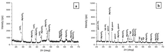 Qualitative phase analysis by X-ray diffraction of the fresco element with low adhesion to the sandstone wall: (a) mortar; (b) pictorial layer.