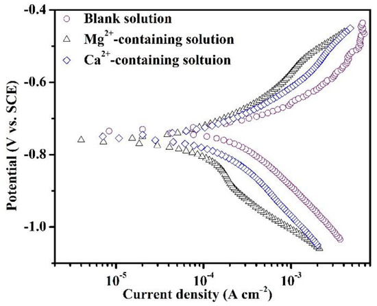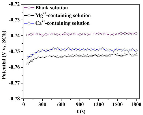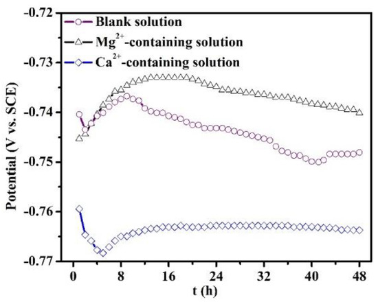 The evolution of OCP of the specimens in all the solutions for 48 h is recorded in Figure 7. The OCP curve of the specimen in the blank solution is characterized by an initial increase and reaches a maximum value at 8 h, and then drops after 8 h. When the immersion time is more than 40 h, the curve displays a stable fluctuation. The presence of Ca2+ in the solution decreases the OCP value with respect to the blank solution, and the curve presents a stable fluctuation only after 16 h of immersion. This demonstrates that the Ca2+ addition predominantly suppresses the cathodic reactions. However, the existence of Mg2+ causes a positive OCP shift, with the corrosion potential reaching a maximum value at 16 h.