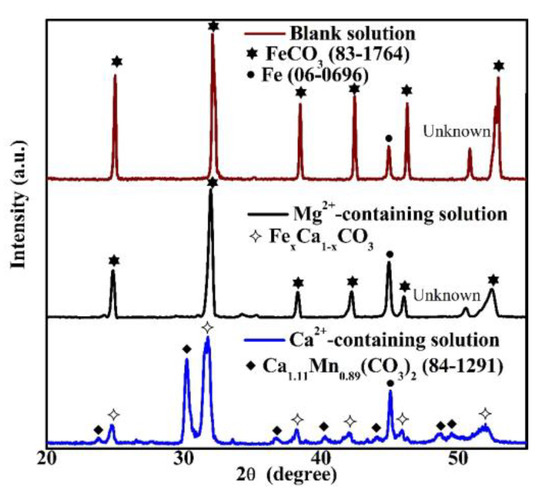 XRD measurements were conducted in order to analyze the crystal structures in Figure 4. When the specimen was put in the blank solution, the notable crystal structure in the corrosion scale was FeCO3, as shown in Figure 5. This crystal structure is determined based on the database of the International Centre for Diffraction Data [21]. For the corrosion scale in the solution containing Mg2+, only FeCO3 is recognized (Figure 5). However, if Ca2+ is present, the corrosion scale consists of FexCa1−xCO3 and Ca1.11Mn0.89(CO3)2 (84–1291) [21]. The identification of FexCa1−xCO3, which is an intermediate compound between CaCO3 and FeCO3, is obtained based on the XRD results of Esmaeely et al. [8]. The Ca1.11Mn0.89(CO3)2 identified in the corrosion scale may be related to the dissolution of MnS in X100 pipeline steel [22,23].