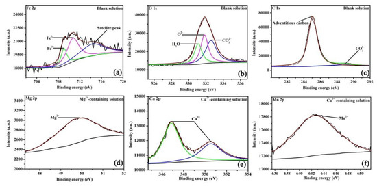 As XRD cannot detect the amorphous phase or trace amounts of crystalline structures, XPS was tested to precisely analyze the valence states of elements in the corrosion scales. Figure 6 shows the high-resolution XPS pattern of corrosion scales on specimens after 48 h of OCP measurements. Fe, O, and C elements are present on all scales and formed in different solutions. In the blank solution (Figure 6a), the Fe 2p peaks at 709.9, 710.9, and 714.5 eV, which are assigned to Fe3+, Fe2+, and the satellite peak, respectively [24,25]. In Figure 6b, the O 1s peaks at 530.9, 531.7, and 532.7 eV, which are ascribed to the presence of H2O, O2−, and CO32−, consecutively [24,25]. Fe3+ and O2− correspond to Fe2O3, while Fe2+ and CO32− are attributed to FeCO3. However, it is unclear whether Fe2O3 formed in the solution or resulted from oxidation after being removed from the solution [22]. Figure 6c shows a small peak at 289.6 eV, which is attributed to CO32−. For the Mg2+-containing solution, apart from the peaks assigned to Fe2O3 and FeCO3 (see supplementary information), the peak of Mg2+ (Figure 6d) appears at 49.9 eV, which belongs to MgCO3. MgCO3 may be produced by the local pH increase as a result of cathodic reactions (2) and (3). XRD cannot find MgCO3 in the corrosion scale, either because MgCO3 is amorphous or because the content of MgCO3 (even if it is crystalized) is low. When Ca2+ is added (Figure 6e), the fitting peaks for Ca 2p appear at 346.8 and 350.5 eV, which can reflect FexCa1−xCO3 in the corrosion products [26]. In Figure 6f, the peaks of Mn are seen in the scale in Ca2+-containing solution, which further identifies the formation of Ca1.11Mn0.89(CO3)2 [26]. The XPS plots demonstrate that either Mg2+ or Ca2+ in the NaCl solution saturated with CO2 can affect the scale structures by forming carbonate species. The concentration of various bonds identified in the current study is important for determining the corrosion process of steel; this information will be provided in a future study.