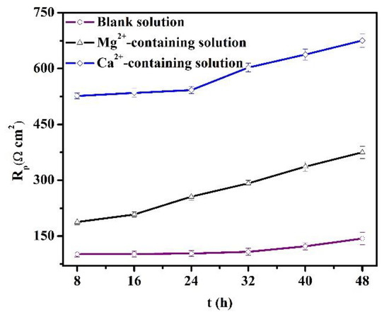 During the OCP tests, LPR was also measured to understand the evolution of longer-term corrosion. In Figure 8, the Rp values increase versus time for the specimens in all the solutions. The increase in the Rp values is usually attributed to the thickening of the protective scale [28]. Also, the Ca2+ addition significantly amplifies the Rp values, while the Mg2+ in the solution causes a negative shift of the Rp values. As indicated in Section 3.1, the Mg2+ in the solution can inhibit the short-term corrosion of specimens. Thus, the concentration of Fe2+ produced by the steel dissolution declines, and the precipitation rate of protective scale is impeded. Lower Rp values for specimens in the Mg2+-containing solution were triggered by the relatively low formation rate of the corrosion scale. In contrast, the presence of Ca2+ in the solution accelerated the formation of corrosion scale.