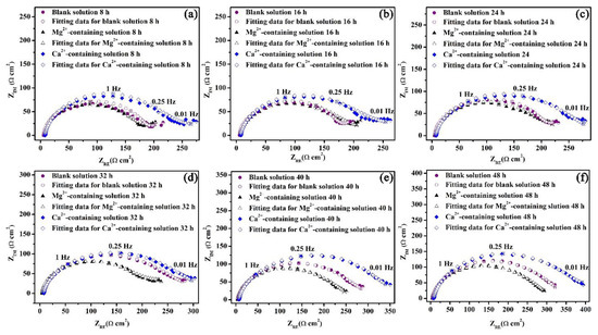 Nyquist plots for the specimens in the blank solutions with various additions for 8 (a), 16 (b), 24 (c), 32 (d), 40 (e), and 48 (f) h.