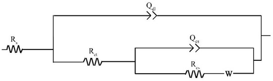 The Nyquist plots for the specimens exposed to the three solutions for 48 h are shown in Figure 9. To make a qualitative comparison of the curves presented in Figure 9, it is necessary to model the datasets with electrical equivalent circuits. Rs(Qdl(Rct(Qcs(RcsW)))) is used to interpret the steel/solution interface of this study (Figure 10) with the Warburg element selected based on a previous study [29]. The circuit elements and their notations in Figure 10 are as follows: Rs is the solution resistance, Qdl is the constant phase element (CPE) for the electrical double layer, Rct is the charge transfer resistance, Rcs is the corrosion scale resistance, Qcs is the CPE for the corrosion scale, and W is the Warburg diffusion element. The chosen equivalent circuit gives good fits between the simulated and measured results for all cases in this work. The values of Chi-Square (X2) for all the EIS data are approximate 1 × 10−4 (Supplementary information).