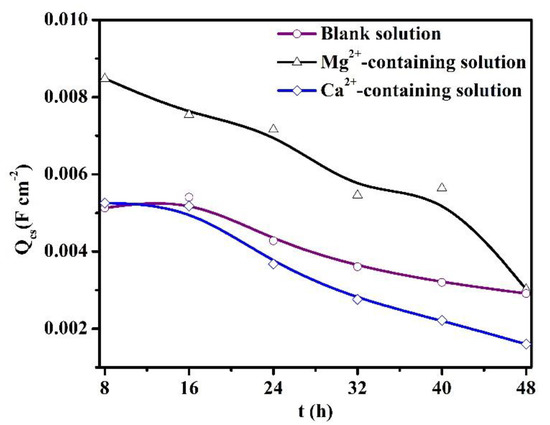 The Qcs values are presented in Figure 11. The Qcs reflects the available area for the cathodic reaction, which predominantly occurs at the cementite of carbon steel [30]. For the blank solutions, the Qcs values decline as time increases, illustrating the thickening of the FeCO3 scales and the decrement of the available cathodic area [30]. Thus, the cathodic reactions are predominantly suppressed, which is corroborated by the decline in OCP values after 8 h of immersion (Figure 7). The variations of Qcs values, Rp (Figure 8), and the thickness of the corrosion scale (see the supplementary information) validate the thickening of the protective corrosion scale over time. In addition, when the X100 pipeline steels were placed in three solutions for the same amount of time, the presence of Ca2+ decreased the Qcs values, while the addition of Mg2+ increased the Qcs values. One explanation for the variations of Qcs values would be the different formation rates of corrosion scales when Ca2+ or Mg2+ are present. The Mg2+-containing solution is characterized by the relatively low formation rate of the protective scale, while the presence of Ca2+ in a solution can accelerate the formation of the protective scale.