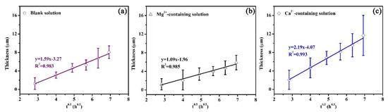 Plots of average scale thickness versus time for the corrosion scales on the specimens exposed to the blank solution (a), Mg2+-containing solution (b), and Ca2+-containing solution (c).