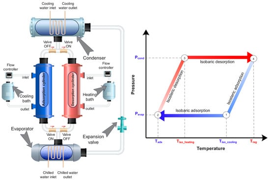 Working schematic of the AHP system (left) and ideal cycle pressure–temperature–uptake diagram (right).