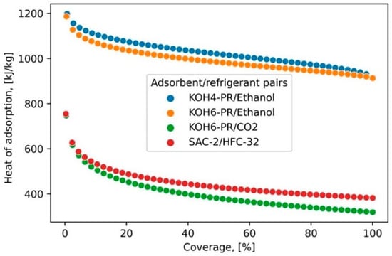 Phenol resin (PR) is another adsorbent class manufactured from agriculture biomass for various heat transformation applications. El-Sharkawy et al. [40] developed two PR derivatives activated with potassium hydroxide (KOH), namely KOH4-PR and KOH6-PR, in communication with ethanol as a refrigerant from the perspective of developing a next-generation AC system. In this regard, the isothermal characterization was performed using thermogravimetric analysis. In addition, adsorption isotherm modeling was performed using a Dubinin–Astakhov (D–A) model. The results indicated that the KOH6-PR is capable of uptake of 2 kg of ethanol per kg of KOH6-PR and 1.43 kg of ethanol per kg of KOH4-PR. Uddin et al. [41] investigated CO2 adsorption on KOH6-PR. The results reveal that the KOH6-PR ethanol can uptake 1.69 kg of CO2 per kg of KOH6-PR. Sultan et al. [42] investigated the adsorption of HFC-32 on spherical activated carbon (SAC-2) and reported uptake of 2.34 kg/kg. These PR derivative/refrigerant pairs could outperform if employed in the AHP system due to their porosity and adsorption potentials.