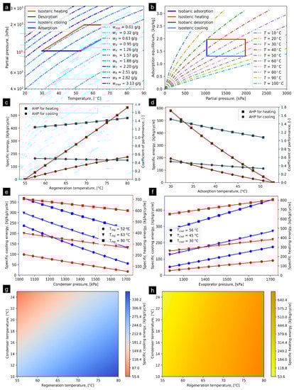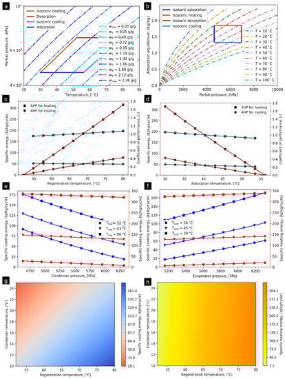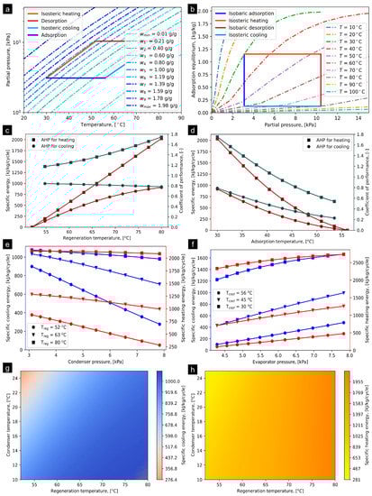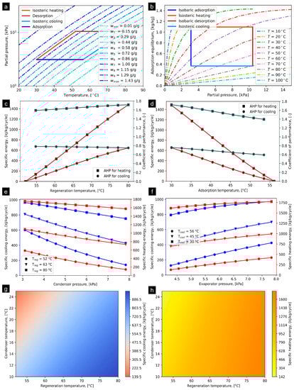 The ideal cycle and/or P–T–U for KOH4-PR/ethanol is presented in Figure 6a, determined at operating conditions provided in Table 1. The Tiso_heating and Tiso_cooling were computed to be 51.95 °C and 56.12 °C, respectively. The net adsorption uptake of ethanol on KOH4-PR is estimated to be 0.727 kg/kg at the operational states provided in Table 1. Figure 6b presents the simulated adsorption equilibrium profiles of KOH4-PR/ethanol at a temperature range from 10 °C to 100 °C regarding superimposing the AHP cycle. It is noteworthy that the fitting constants of the adsorption equilibrium were computed for the temperature range between 30 and 70 °C [40]. However, for higher temperatures (>70 °C) and lower temperatures (<30 °C), the adsorption uptakes are simulated using the D–A model varying the temperature parameter. Based on the saturation properties of the ethanol, the Pevap and Pcond are assumed to be 3.11 kPa and 10.41 kPa, respectively. Figure 6c shows the effect of Treg from 50 °C to 80 °C on specific energies and COPs that can be obtained from the KOH4-PR/ethanol pair. It has been observed that, corresponding to increase in Treg, the SCE and SHE linearly increase. At Treg of 80 °C, the SCE and SHE approach maximum potential, with values of 643.85 and 1474.12 KJ/kg/cycle, entailing maximum COP of 1.78 and 0.79, respectively. On the other hand, it corresponds to an increase in Tads, with both specific energy and COP both for heating and cooling applications linearly decreasing, as shown in Figure 6d. This implies that the Treg = 80 °C and Tads = 30 °C are supportive in order to obtain the maximum potential (either cooling or heating) from the KOH4-PR/ethanol. Figure 6e shows the effect of Pcond on both SCE and SHE at Treg of 52 °C, 63 °C, and 80 °C, differentiated with markers. The study reveals that Pcond of 3.11 kPa and Treg of 80 °C is promising in terms of producing high SCE (980 kJ/kg/cycle) and SHE (1790 KJ/kg/cycle). The increment in the Treg reflects the step-based improvement in both SCE and SHE, whilst the degraded corresponds to an increase in Pcond. Figure 6f shows the effect of Pevap and Tcool on SCE and SHE. The results depict that nearly linear increments of SCE and SHE correspond to an increase in Pevap. Also, the step-based increment reflects the significant improvement in the overall SCE and SHE. The maximum SCE of 960 kJ/kg/cycle and SHE of 1750 kJ/kg/cycle were computed at Pevap of 7.85 kPa and Tcool of 30 °C. Figure 6g,h show the detailed impact of Tcond, varying from 10 to 25 °C and Treg from 51 to 80 °C at Tevap = 10 °C on both SCE and SHE for developing better understanding as well as visualization of the trends. It can be concluded that the impact of Tcond on both SCE and SHE is ignorable at Treg > 70 °C. The extended results regarding the influence of operating parameters on the SCE, SHE, COPcooling, and COPheating are provided in Appendix A accordingly.