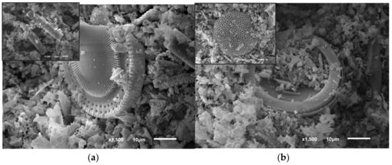 Figure 1a indicates that the raw material exhibited highly porous disk- and rod-like shapes, with sizes of approx. 0.5–50 μm. Numerous well-developed pores can be clearly observed, indicating the high honeycomb porosity and accessible surface of diatomite as expected. It was also found that the natural mineral showed specific surface area of up to 30.0 m2/g. However, there were many inclusions on the surface of the raw diatomite. Most of the pores on the surface of diatomite were opened. The average diameter of the pores was observed to be approximately 50–500 nm in the peripheral area of the diatomite disk. In Figure 1b, after washing the surface of the diatomite in general, it became clean, with clearly identifiable channels. We can clearly see that the porous structure of the diatomite changed as expected after the purification process.