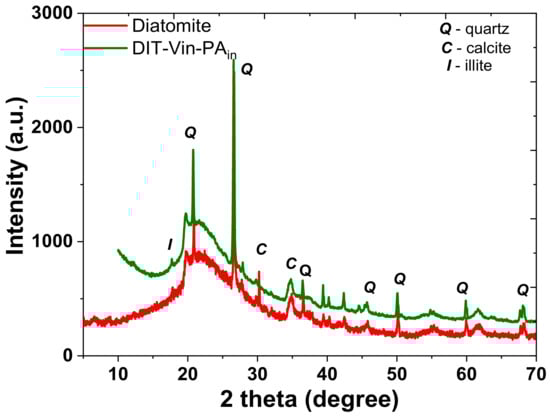 In the FTIR spectra of all diatomite-based samples, the vibration bands appeared at approximately 1250, 1090, 798, and 470 cm−1, which could be attributed to the condensed silica network (Figure 6). The intense broad band observed at 1000–1200 cm−1 was assigned to the stretching vibration of the Si-O-Si siloxane group framework bonds. In the spectra, only the low peak at 700 cm−1 represented the bending vibration of the Al–O groups; the peak at 679 cm−1 indicated the vibration of the Mg-O groups of the diatomite. The characteristic shoulder of the stretching vibrations of Fe-O at 570 cm−1 did not appear. In addition, the peaks at 2860 cm−1, 2930 cm−1, 955 cm−1, and 842 cm−1 were caused by the stretching vibration of the –C-H functional groups. The C-H bands in the FTIR spectra of the natural diatomite appeared without the chemical modification of the surface. Diatomite could contain the carbon element because it formed from the accumulation of single-celled aquatic plants of diatoms [,]. Carbon was the main element of the algae plant. The C-H peak was instead related to the organo-modified materials rather than to the other natural silica-based minerals []. The band at 3750 cm−1 corresponded to the single silanol groups (SiO-H), and the broad band at 3425 cm−1 represented the H-bonding vibration of the OH-groups from the Al-OH, Mg-OH, and Si-OH fragments. In addition, the peaks of symmetric stretching vibrations of the SiO-H bonds at 798 and 950 cm−1 were observed. All these characteristic peaks suggested that the tested diatomite contained mainly silica dioxide. These data are consistent with the XRD analysis.