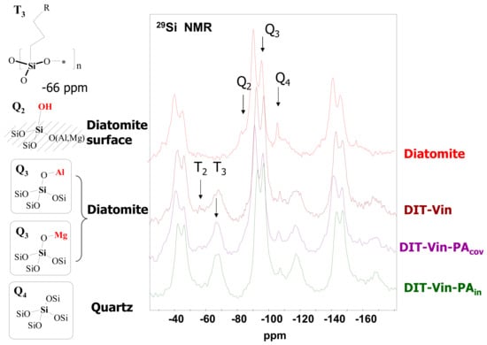 The 29Si MAS NMR spectrum of the natural diatomite, besides the major signals at −92.7 ppm (Q3 = HO−Si(OSi)3, MgO−Si(OSi)3, or AlO−Si(OSi)3 sites) and −107.6 ppm (Q4 = [Si−(OSi)4] sites of quartz), showed that the peaks for DIT-Vin, DIT-Vin-PAin, and DIT-Vin-PAcov samples could be assigned to different Q species, i.e., geminal silanols (Q2, δ = −99.1 ppm), single silanols (Q3, δ = −102.9 ppm), and siloxane groups (Q4; δ = −110.2 ppm), and contained different Tn species (1 < n ≤ 3), where n is related to the number of siloxane bonds formed between the surface and the functional center at −60.9 and −65.1 ppm that can be assigned to T3 [R−Si−(OSi)3] and T2 [R2−Si−(OSi)2] groups, respectively. The effect of the silanization corresponding to the covalent Si-C bond on the surface of adsorbents indicated the presence of the polycondensed layer of organo-silane on the diatomite surface.