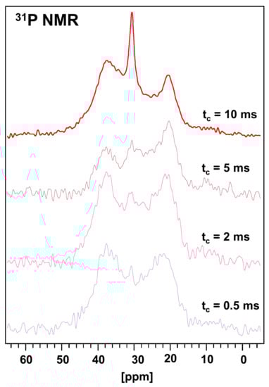 The magnitude of the chemical shift and the width of the 31P MAS NMR signal is an important tool for explaining the interactions of phosphonic acids with the matrix based on the oxide materials [,]. The 31P CP/MAS NMR spectra of the DIT-Vin sample with contact times of 0.5, 2.0, 5.0, and 10.0 ms are shown in Figure 4. Many fuzzy peaks and noises at the low times appear in the spectra of the diatomite with the physically adsorbed H3PO3 (DIT-Vin sample). The peak intensities for the 31P spectra changed as the time changed. The intensities for the main peaks of the phosphonic groups increased, and those for the noises decreased, as t increased. The observed 31P peaks of the DIT-Vin sample were assigned by triad configurations. Namely, these signals at 35.2 ppm, 27.9 ppm, and 19.2 ppm are believed to be related to the various types of phosphonic acid centres present in the natural material. This might have been due to the interaction between the canter bonding (-Mg-OH, ≡Si-OH, and =Al-OH) of the diatomite and H3PO3 that led to the “apparent” difference in their acidic activities. The 31P MAS NMR spectra were also recorded for the other P-containing diatomite samples (see Figure 5).