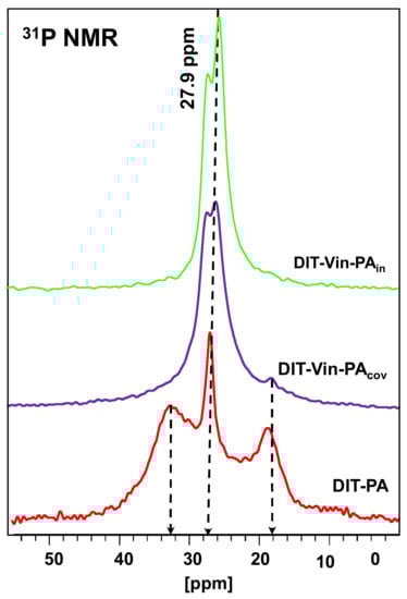 The 31P MAS NMR spectra (Figure 5) displayed intensive signals only at 28–30 ppm, indicative of the formation of uniform phosphorus environments using both covalent approached for synthesizing the diatomite samples with the immobilized phosphonic groups (DIT-Vin-PAcov and DIT-Vin-PAin samples). In the 31P NMR spectra of the phosphonic acids on the diatomite surfaces, there was a low shift and a splitting of the signal into two components: a low-field shift (up to 1–3 ppm) of the narrow component of the doublet due to the physically adsorbed acid molecules and signals of expanded high-field resonances (equaling 5–7 ppm), which could be attributed to the chemicals bounded with the diatomite surface phosphonates by forming the C-OP bonds []. The unsuccessful interaction of the phosphonic acids with the diatomite in the non-polar solvents is due to the instability of the Si-O-P and (Mg/Al)-O-P bonds [] in contrast to the DIT-PA sample, which allowed their modification in aqueous media.