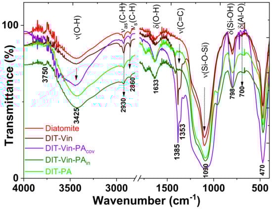 The chemical modification of the diatomite by the vinyl functional groups was accompanied by the ν(C-H), δ(C-H), and ν(C=C) stretches. The new intensive band around 1385 cm−1 was assigned to the δ(C-H) bending of the vinyl groups. The DIT-Vin-PAin spectrum also did not display transmittances due to ν(SiO-H(isolated)) (3750 cm−1) and ν(SiO-H(vicinal)) (3660 cm−1), reflecting the relatively low concentration of the residual silanols and the hydrophobicity of the sample. The peak intensity of SiO-H and O-H in the modified diatomite was higher than that in the starting diatomite, possibly because the silanization reaction increased the quantity of SiO-H and OH by means of silane incorporation. The νs(P-C) bands at 720–790 cm−1 and νs(P-O) at 1100–1270 cm−1 could not be identified in the real spectra of organo-diatomite because of the overlap with the bands of diatomite (mainly SiO2 matrix) supporting the absorption region.