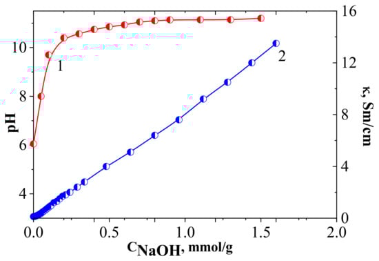 pH-metric (1) and conductometric (2) titration curves of natural diatomite (Conditions: total volume 20 mL, weight 0.05 g, C(NaOH) = 0.01 M, 25.0 ± 0.02 °C).