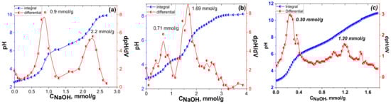 Then, pH titration was used to test whether the natural diatomite was indeed capped by the protolitic-active functional groups (Figure 8). The polyfunctional surface of the obtained material made it difficult to determine the accurate concentration of the acidic centres from the potentiometric titration alone; thus, the corresponding first derivative of the titration curves was applied.