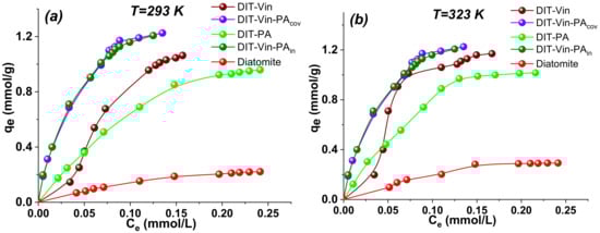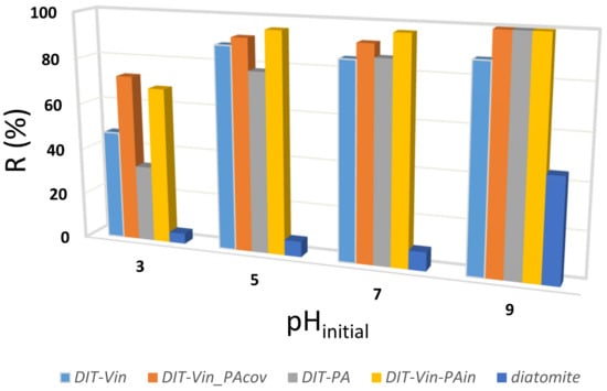 As shown in Figure 10, the pH values were significantly changed for the adsorption of the U(VI) ions by the studied adsorbents from the aqueous solutions. The decrease in pH upon adsorption of the U(VI) ions by the P-containing samples (DIT-Vin-PAcov, DIT-PA and DIT-Vin-PAin) was higher compared with the natural diatomite. In the case of DIT-Vin in the entire range of the initial pH of 3–10, the pH value in the equilibrium solutions was near 4.1, while for DIT-Vin-PA, this value was much lower and amounted to 3.1–3.6. This could be attributed to the fact that the phosphonic functional groups on the surfaces of DIT-PA, DIT-Vin-PAcov, and DIT-Vin-PAin were able to form stable chelates with U(VI). It is clear that the sorption process was scarcely influenced at all the pH values, suggesting that the dominant mechanism is inner-sphere surface complexation rather than outer-sphere surface complexation or ion exchange [,]. The highest adsorption capacity in the entire tested pH range was found for the DIT-Vin-PAcov and DIT-Vin-PAin samples.