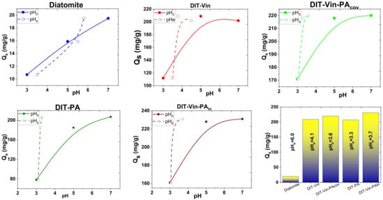 Firstly, the pH effect of the U(VI) ions entrapment onto the natural diatomite and the obtained samples was evaluated, as shown in Figure 9.