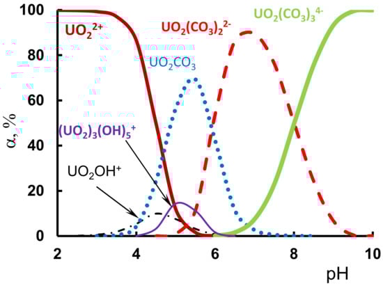 The pH effect on the U(VI) ion sorption could be explained by the surface characteristics of the adsorbents and the speciation of the metal forms in the solute. The curves representing the change in U(VI) adsorption percentage with pH were calculated with MINTEQ 3.1 (Figure 11).