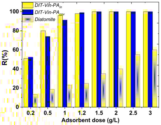 It can be seen that the percentage of U(VI) adsorption increased with increasing DIT-Vin-PAin and DIT-Vin-PAcov dosages, and an almost complete removal (~100%) of U(VI) from the wastewater samples was achieved with 1.5 g DIT-Vin-PAin and DIT-Vin-PAcov in 1.0 L. Therefore, the optimum adsorbent dose was kept at 1.5 g/L for the adsorption experiments.