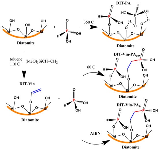 Route I involved the preparation of a P-containing functional group with direct interaction of raw diatomite with H3PO3 (non-covalent approach) combined with calcination. In Route II, the natural diatomite was reacted with trimethoxy(vinyl)silane followed by a salinization reaction (covalent approach). Silanization of the diatomite is associated with the interaction of silanes with the hydroxyl groups present on the inner walls and the surface of the natural diatomite (mainly ≡ Si-OH). Two synthetic approaches were applied for the phosphorylation of the vinyl-functionalized diatomite (DIT-Vin). In the first route, DIT-Vin was reacted with the H3PO3 solution in the presence of AIBN as an initiator (DIT-Vin-PAin). In the second route, DIT-Vin along with heating was reacted with the H3PO3 solution (DIT-Vin-PAcov). Based on this, H3PO3 was also directly covalently immobilized on DIT-Vin.
