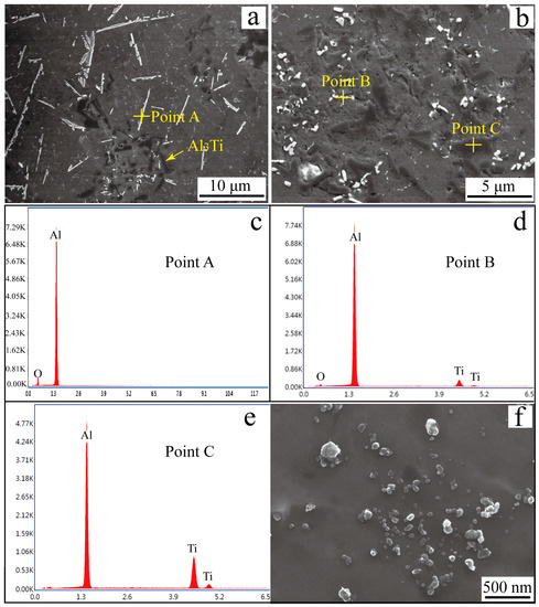 The SEM images of Al3Ti-Al2O3/Al inoculants and the EDS patterns of the second phases are presented in Figure 2. The matrix contained distributed rod-like and granular second phases, as illustrated in Figure 2a. In Figure 2b, it can be seen that the granular second phases were nanometer and submicron in size. The rod-like second phases were alumina whiskers, and it can be found that there were craters on the surface of the alumina whiskers and the whisker length was obviously reduced. At high temperature (1600~1700 °C), Al2O3 will decompose and release O atoms, the O atoms can easily combine with the Ti atoms in the melt to form TiO2 or Al2TiO5 [43,44,45]. However, no diffraction peaks corresponding to other phases were observed in the XRD pattern shown in Figure 1, probably because too few reaction products were generated to be detected. Because Al2O3 can react with titanium at high temperatures, titanium in the Al-Ti master alloy will corrode the whisker and break it. The EDS pattern of point B indicates that the particles in Figure 2b were the chips dropped from the alumina whiskers after being fragmented. The gray phases in Figure 2a,b are Al3Ti, and it can be seen that before the vacuum rapid quenching treatment, its morphology was short rod. The refining effect of large particles was less than ideal when compared to that of fine particles. Therefore, to achieve optimal refining results, the inoculant ingot was rapidly quenched under vacuum conditions. The SEM image of the Al3Ti-Al2O3/Al ribbon in Figure 2f reveals a disappearance of large rod-like Al3Ti particles and an emergence of numerous gray nanoparticles. In the process of remelting, the Al3Ti particles were dissolved in liquid aluminum. In the subsequent solidification stage, due to the rapid cooling rate, these particles did not have sufficient time to grow and, thus, resulted in the formation of numerous nanoparticles.