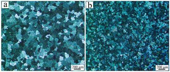 To evaluate the refining effect of Al3Ti-Al2O3/Al inoculant on Al-Cu-Mn alloy, 1 wt.% of the inoculant was introduced into the alloy. The metallographic images of the Al-Cu-Mn alloy, both pre- and post-inoculation, are depicted in Figure 3. The addition of the inoculant resulted in a significant reduction in grain size for the Al-Cu-Mn alloy. The main reasons for the decrease in the grain size after adding Al3Ti-Al2O3/Al inoculant were as follows: first, Al3Ti can serve as a heterogeneous nucleation site for α-Al; second, Ti can limit the growth of aluminum grains; third, the calculation results show that Al2O3 and Al also had crystal orientation relationships and, therefore, it can serve as a site for heterogeneous nucleation of α-Al during the solidification process of the alloy.