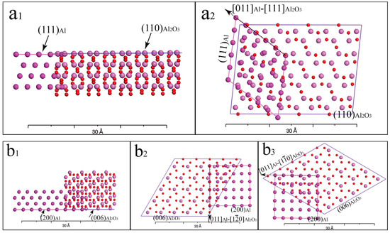 Schematic diagram of the lattice matching between Al and Al2O3. (a1) (111)Al//(110)Al2O3; (a2) [011]Al//[111]Al2O3; (b1) (200)Al//(006)Al2O3; (b2) [011]Al//[10]Al2O3; (b3) [011]Al//[10]Al2O3.