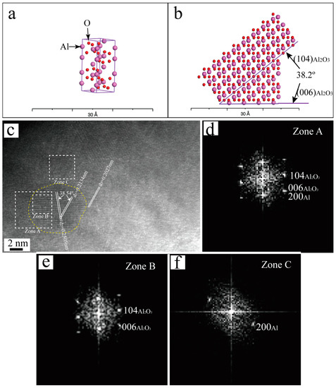 The HRTEM image of the Al-Cu-Mn alloy inoculated with the Al3Ti-Al2O3/Al inoculant is presented in Figure 5c, revealing a slight variation in atomic arrangement within the circular box region compared to its surrounding area. The measurement results show that the interplanar spacing d1 was 0.2134 nm and d2 was 0.2505 nm, and the angle between the two crystallographic planes was 38.54°. Figure 5a is the simulation of Al2O3 lattice built by MS 7.0 software. Figure 5b is the simulation of (104) and (006) planes cut from Al2O3 lattice, the plane spacing of (104) and (006) was 0.255 nm and 0.217 nm, respectively, and the angle between them was 38.2°. It indicates that the phase of the round frame region corresponded to the Al2O3, and so, the round frame area can be identified as Al2O3. Figure 5d–f depict the fast Fourier transform (FFT) patterns of zones A, B and C. As evidenced by the HRTEM image and FFT pattern, the (006)Al2O3 plane was parallel to (200)Al with closely matched plane spacing. The analysis results indicate that a perfect interface can be formed between Al2O3 and Al, thus enabling Al2O3 to serve as the heterogeneous nucleation site for Al. These test findings are consistent with the aforementioned theoretical analysis.